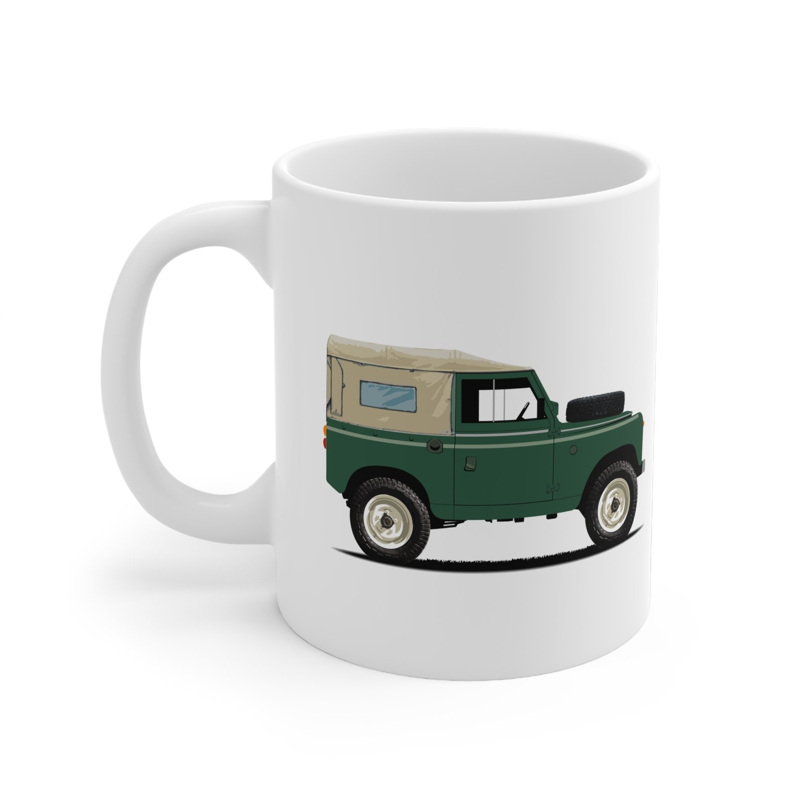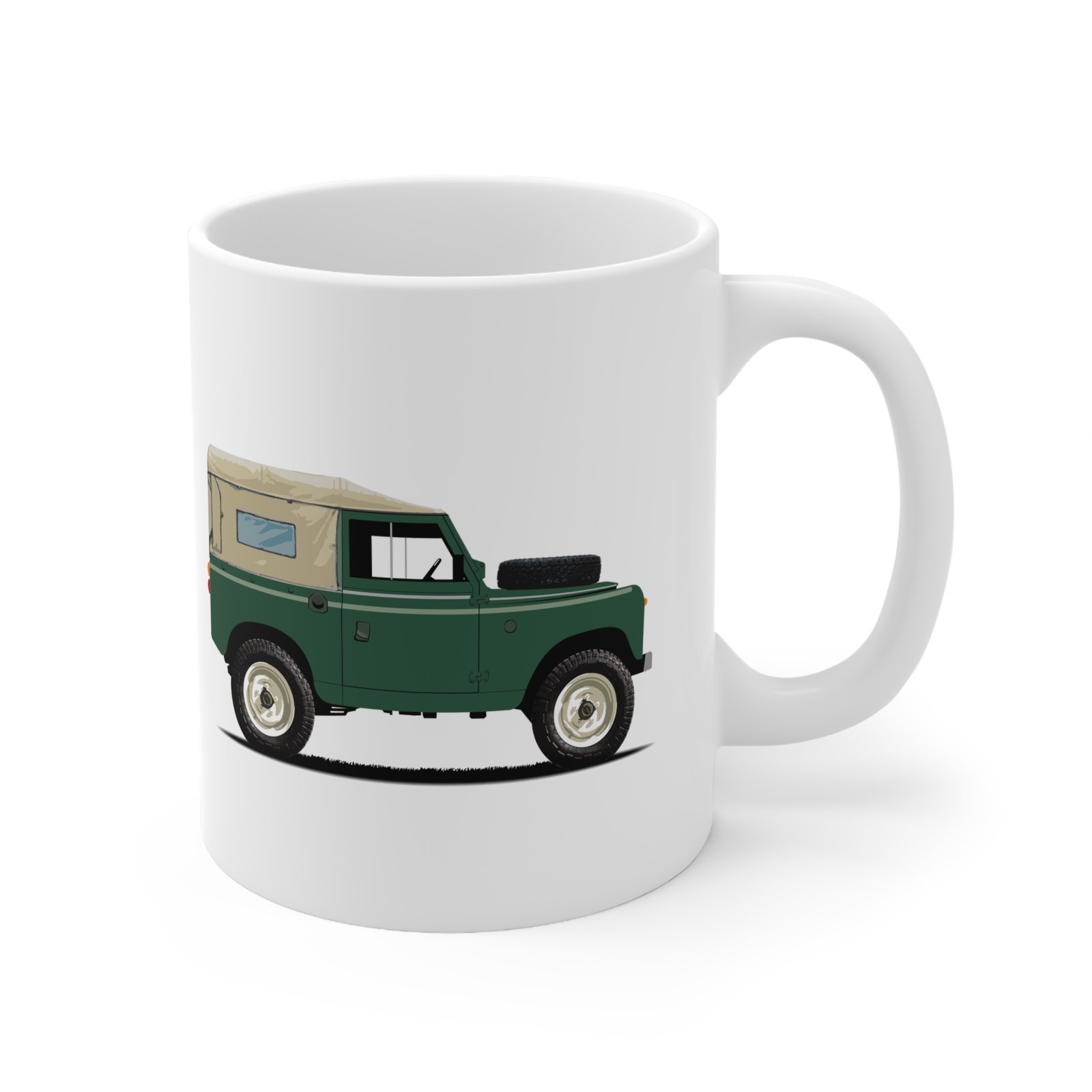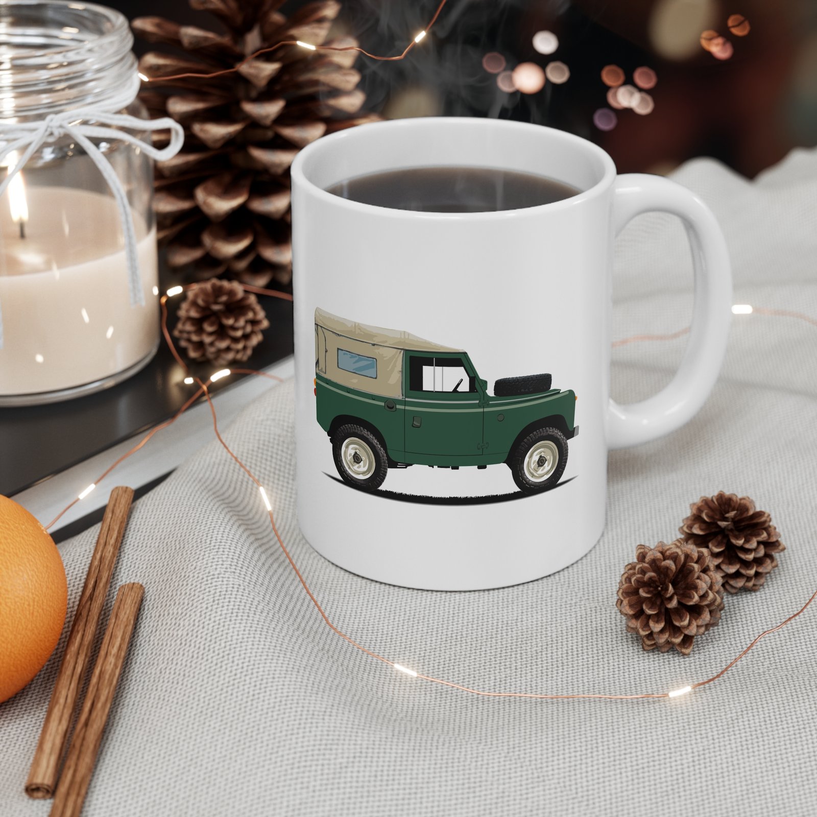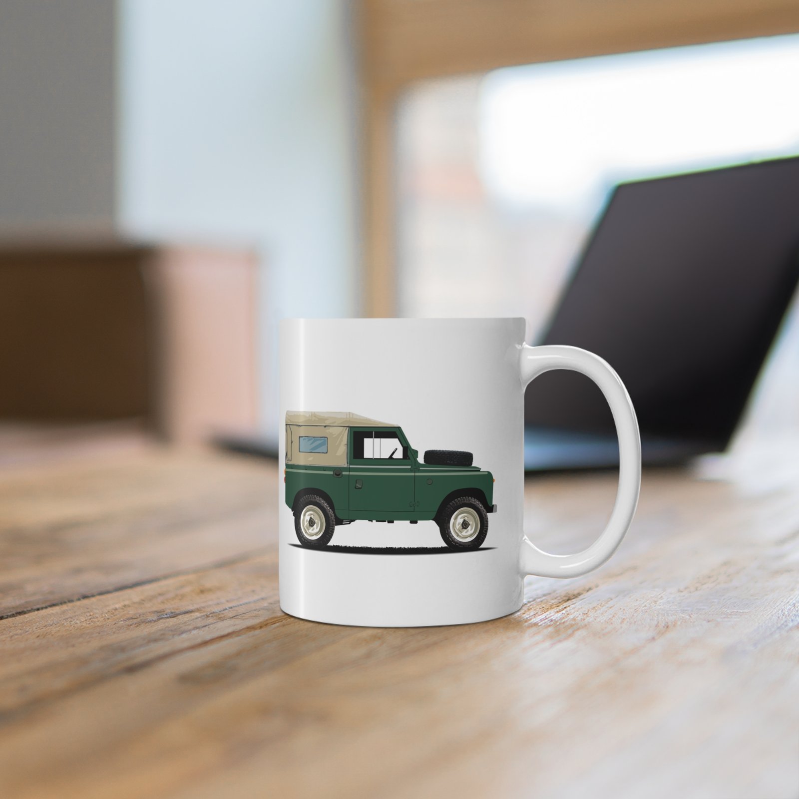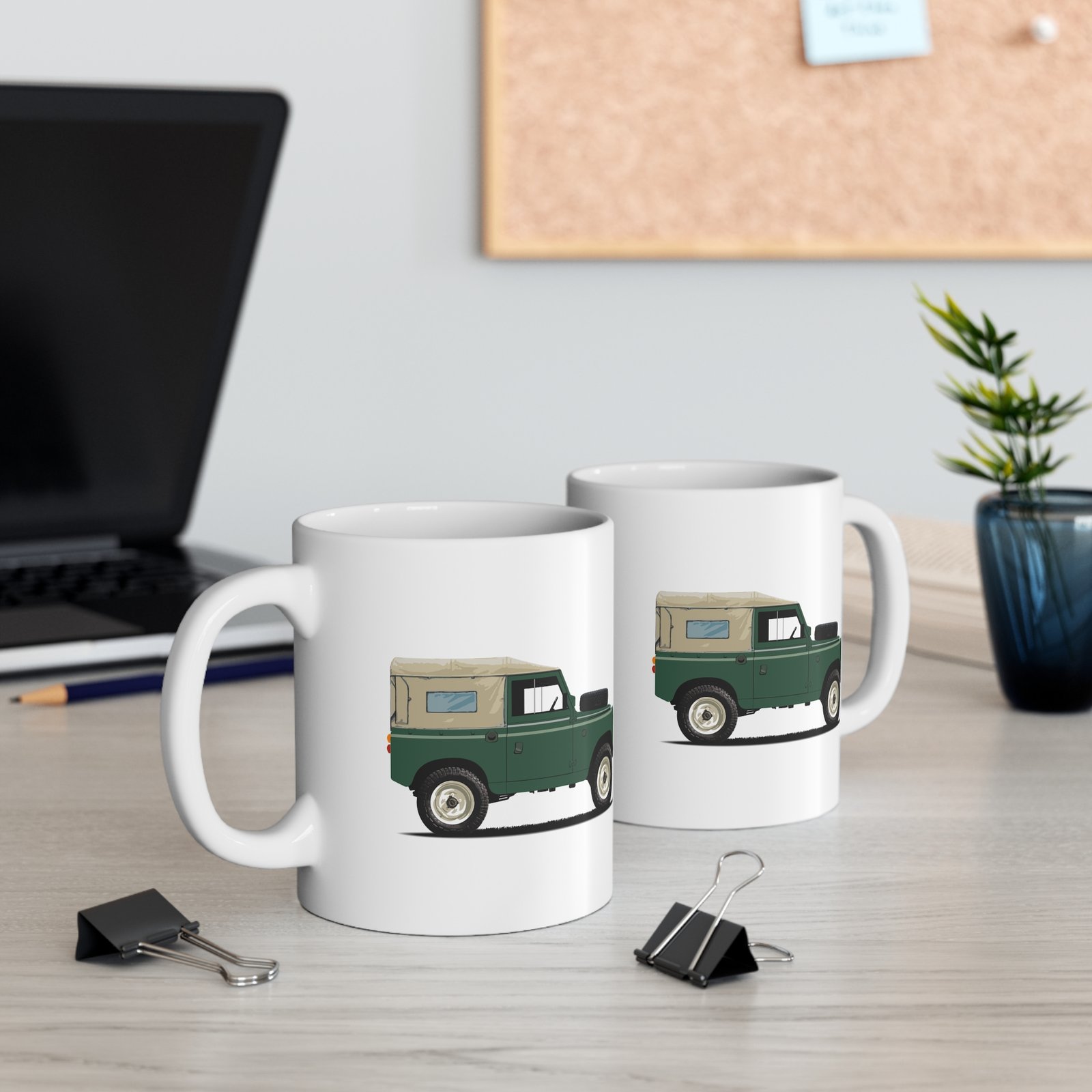 Enjoy your favorite hot beverages in style with this Land Rover SWB Canvas Green ceramic mug. The vibrant colors and unique design create a rugged and adventurous vibe, perfect for outdoor enthusiasts and lovers of vintage cars. This mug is dishwasher and microwave safe, making it convenient for daily use or as a gift for Land Rover fans.